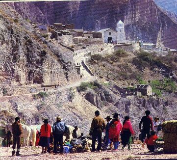 La gente tenía huertas más arriba en las montañas, en la meseta, donde a duras penas consiguen el sustento de la tierra gris y rocosa. Asombrosamente consiguen enormes porotos, arvejas, maíz de colores, una variedad de papas, colorados según el mineral dominante de la zona. Y duraznos pequeños pero muy dulces. Tienen cabras, ovejas, vacas flacas. Pero como no tenían electricidad más que por dos horas diarias y algo más los días de fiesta, no tuvieron heladeras. Por lo tanto, la carne fue traída al pueblo seco y puesto sobre las lomas de los burros, la sangre habiendo sido previamente drenada en lugares especiales para nutrir la tierra.