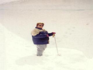 (Real story:- To my upperleft is the edge of the glaciar, the pale blue of the ice pack can just be seen. We had ski sticks to help us as at times you could sink your foot in up to the knees. At times it was slippery where others had walked before.
