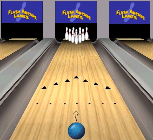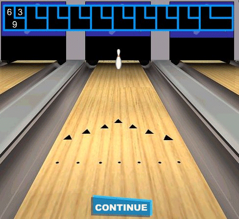 Por fim tens de tentar derrubar os pinos todos abaixo. Utiliza o teu rato e carrega na bola, até veres a seta que te indica a direcção em que a bola vai...