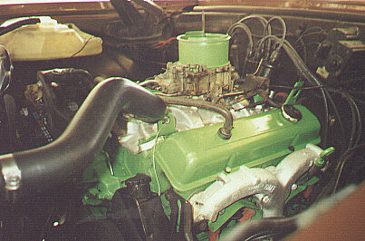 Engine-Chevy 350, 4 bolt mains,1.94 Intake and 1.60 Exhaust Valve, I Just Replaced the Old Pathetic 4 Blade Fan That Was Too Far Away and Got a 7 Blade GM Flex Fan From the Junkyard for 4 bucks, Came with a Big Spacer so The fan is Closer to the Radiator now, The Engine is Painted with Grabber Green Engine Enamel by Dupli-color, 9:1 Compression Ratio, Approx. 230 HP and 290 Ft-Lbs of Torque and special thanks to Ron and Ken Nastiuk at 'Northwest Automotive' Here In Calgary For They're Great Effort And Work To Install The Engine!