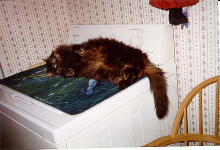 This is my cat Nina, I always call her kitty though :) I make stupid noises ya know, the kind adults like to make to newborn babies and I say,"I wuvvv youuuu kiiittyyyyy!" *LOL* She's great and such a ham for a camera ;) This is her posing on top of the washing machine *laughs*