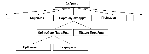 Για παράδειγμα σαν κλάση μπορεί να θεωρήσουμε το σύνολο σχημάτων. Υποκλάσεις σε αυτή την κλάση μπορεί να είναι τα παραλληλόγραμμα, πολύγωνα, κύκλοι ... Στην κλάση των παραλληλογράμμων έχουμε υποκλάσεις τα ορθογώνια και τα πλάγια παραλληλόγραμμα. Στην κλάση των ορθογωνίων πάλι έχουμε τα τετράγωνα και τα συνήθη ορθογώνια. Τέλος η υποκλάση των τετραγώνων περιέχει σαν στιγμιότυπα τα σχήματα που παράγονται από μία διαδικασία SQUARE :X η οποία κατασκευάζει τετράγωνα πλευράς :X.