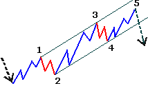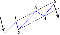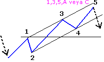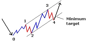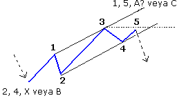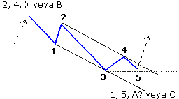 4. dalga biter bitmez 2. dalganın sonu ve 4. Dalganın bitimi birleştirilerek ana trend çizgisi çizilmeli. 3. Dalganın sonundan ana trende paralel çizgi çizilerek kanal oluşturulur. Bu yolla 5. dalga için bir hedef oluşturabilirsiniz. Birçok durumda 5. dalga için ve 5. dalgadaki genişleme ile ilgilendiğiniz durum dışında veya 3. dalganın göreli olarak zayıf olması durumu