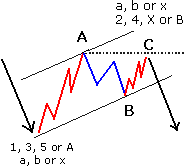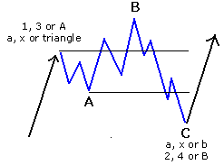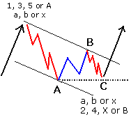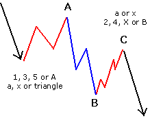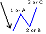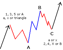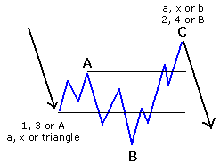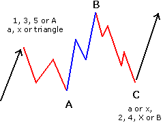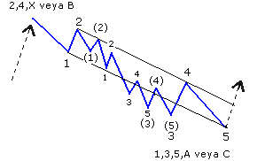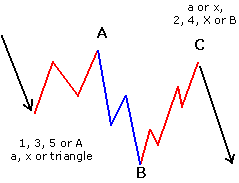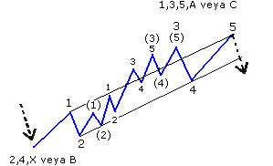 Normalde düzeltme dalgaları üçlüdür. Aşağıdaki şekilde ana düzeltme yönünde beş dalgadan oluşan iki dalga (A ve C) ve buna karşıt yönde üç alt dalgadan oluşan “B” dalgalarından oluşur. B dalgası ise ana itki yönündedir. Küçük dalga derecelerinde “B” dalgası satış yönünde değerlendirilmelidir.