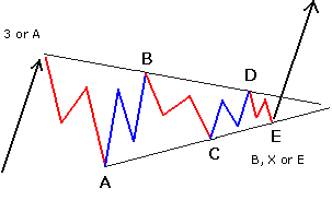 C dalgası biter bitmez E dalgası için hedef belirlemeye yönelik A ve C dalgalarının sonunu birleştirerek bir trend çizgisi çizebilirsiniz. E dalgası neredeyse hiçbir zaman trend çizgisinde durmaz yada trend çizgisine asla ulaşmaz veya trend çizgisini hızlı ve geçici olarak geçmez.