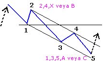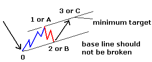 ma faydalıdır. İlk olarak paralel çizgi gelişme altındaki 3. dalga için kesin minimum hedef olarak hizmet eder.Şayet 3. dalga daha üst çizgi boyunca kırılamaz veya ona ulaşamaz ise muhtemelen 3. dalga yerime C dalgası ile ilgileniyor olabilirsiniz. İlaveten orijinden (1. dalganın başlangıcından) 2. dalgaya çizilen temel çizgi durma yeri olarak hizmet eder. Bu temel çizgi kırıldığı zaman 2. dalga veya B dalgasının daha kompleks olmasının güçlü bir ihtimali vardır. Bu nedenle 3. dalga veya C dalgası henüz