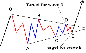 B dalgası biter bitmez D dalgası için bir hedef elde etmek için A dalgasının başlangıcı ve B dalgasının sonu birleştirerek bir trend çizgisi çizilmelidir. Bu gerçekten bir üçgenin gelişmekte olduğunu gösterir (sağlar). Bu C dalgasının tamamlanmasından sonra daha kesinlik kazanır.