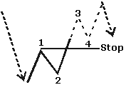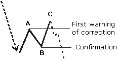 Pattern eğer 4. Dalga 1. Dalgayı örtmez ise itki olabilir. Overlap seviyesi yatay stop-loss çizgisi ile gösterilmiştir. Ücretler stop-loss çizgisinin altına gelir gelmez (5. Dalga tamamlanmadan) ilk kararlaştırılmış askıda olan ilk düzeltme sinyalini aldınız 3. şekil. Ücretin B dalgasının sonu olan C dalgasının başlangıcını altına düştüğü zaman sağlanacaktır. Şayet fiyatlar 3. Şeki