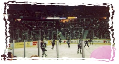This is the white team waiting to be introduced. Some of the players in this picture are: Tommy Salo, Tom Poti, Frank Musil, Alexander Selivanov, Pat Falloon, Georges Laraque, Todd Marchant, Bill Guerin, and Doug Weight.