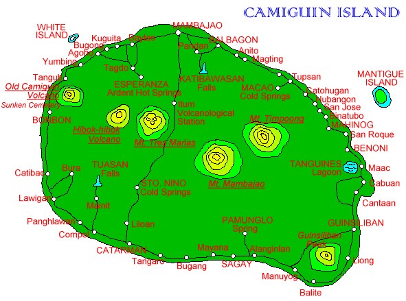 CAMIGUIN is a pear shaped volcanic island province with a total land area of 292 sq.kms. It is located 714 kilometers south of Manila, about 80 kilometers north of Cagayan de Oro and some 120 kilometers from Cebu and 10 kilometers north of Misamis Oriental