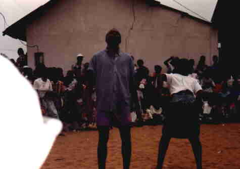 I was lucky to have had the opportunity to attend a festival at Bassam. It was the street arts festival (festival des arts dans la rue). However, unfortunately I didn't actually get to see too much as almost all events in africa, it was about 4 hours late getting under way. It wasn't a waste of time however. I saw the horse races and watched a "trivia pursuit" and got to make friends with these adorable children. For about two hours they seemed to adopt Marie Jose and I. They slowly came closer to touch us and then made themselves comfortable leaning against us for a long time. Eventually a sister came along and apologized to us, but we didn't mind, our only problem was that we didn't speak dioula to speak to them! |