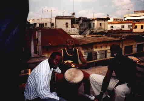 I took this photo on a nice relaxing Sunday afternoon. Lindsay and I had been invited for lunch at Ousmane's (the guy on the right). We ended up spending the entire day with everyone. Lunch was a big bowl of tchep (tomato flavored rice with some vegetables and a big chunk of either fish or meat on top) that was prepared by Ousmane's cousin. After lunch, we also had our first tea experience, but I will explain that process later with the tea pictures I took in Mali. After sitting around the house until about 4 pm or something, we headed up onto a roof where we spent the last 2 hours of sunlight (not to mention the mosque called Ousmane and Yaya away at sundown) playing music and singing (ok, so I just listened, but it was fun). On the left, is the owner of the little shop on top of the roof (cant remember his name) he was singing for the most part, in the middle is Yaya who is playing the djembe, and on the right is Ousmane, playing the balafon which unfortunately didn't make it into the photo. |