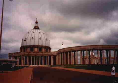 This is the infamous Basilique de Notre Dame de la Paix in Yamoussoukro, Cote d'Ivoire that can be seen from anywhere in the city. That is The Basilica of Our Lady of Peace. You may wonder why it is so famous. Well let me try and tell you. This is the largest cathedral in the world. Larger than St Peters in Rome. How do I know? Well, because on my guided tour for 1000 CFA I was told everything about the cathedral. I repeatedly heard about the cost of building it, the marble imported from Italy, the air conditioning system that cools the spectators just outside of the doors, etc. Upstairs in a little room, there are pictures showing you how large is the dome of the cathedral in Rome, and how this one is bigger, likewise for the steeple and the circumference, etc. |