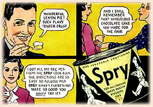 This picture is from the front page of a "Spry" cookbook from the 1930s. Spry, a solid vegetable shortening made by Lever Brothers is no longer made, but many other brand names that have been advertising their products with promotional cookbooks for decades... through the great depression, the wartime era, and the fabulous fifties are still alive and well today, and they still want to give us their recipes. Although cook booklet offers can still be found, most brand names have also taken a time-honored tradition into cyberspace. Everyone from Charlie the Tuna to Chiquita Banana to The Pillsbury Dough Boy has a website and they all offer free recipes. The vintage cookbooks shown on these brand name pages are links to the online cookbooks for those same bands.