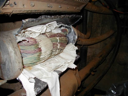| Here I have opened the lead sleeve. The lead was 3/8" to 1/2" thick. The splice was wrapped in the original muslin and here I have cut it open to expose the wirework. It's a twist and sleeve splice. The splicer stripped each wire of its' insulation. He then placed a cotton sleeve over a wire and then twisted each of the wires together to make the connection. He then folded the connection over and slipped the sleeve over the exposed conductor to insulate it. I don't know the process but they would also soak paraffin into the splice. I don't know why they did that. Maybe it acted as glue to keep the sleeves from slipping. | ![]() |