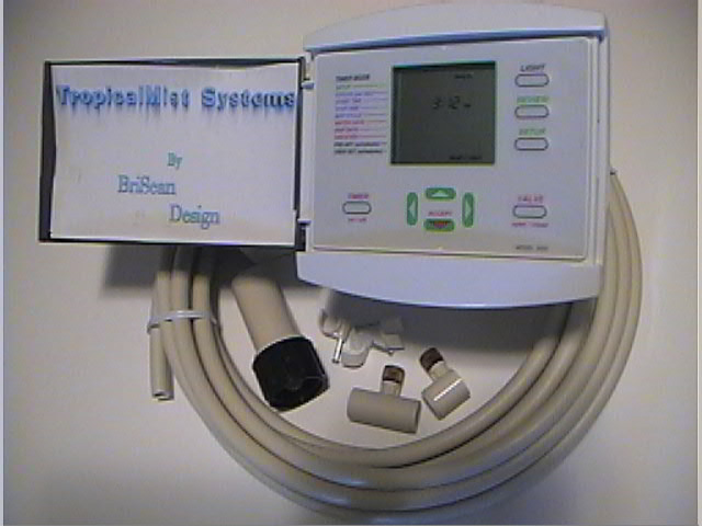| TMS100 - This system hooks up directly to your own water source. Depending on the water pressure in your home up to 45 nozzles can be used with the system. There can be up to 120 on/off cycles per day with unlimited possibilities for cycling schedules. For example: 1st mist cycle from 8:00am until 9:00am - timer would go on at 8:00am, go off at 8:02am, stop for 10 minutes, on again at 8:12am, off again at 8:14am, stop for 10 minutes, and so on until 9:00am. A cycle can also be set for a certain amount of time from a minimum of 1 minute. For example: Misting done from 10:00am until 10:17am continuously.This system also has 5 programmable settings which can be saved,great for cycling reptiles for breeding. |