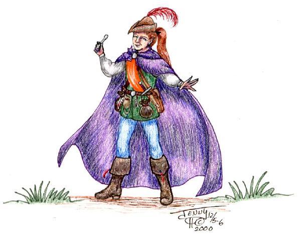 It would be unfair to say that Delbin has been with us since the beginning. In a way, he was the beginning. He is the soul of the group, if Mikhael is the heart, and holds us together in times of greatest need. Irrepressible at best and irritating at worst, Delbin is singularly responsible for many of the party's major triumphs, as well as some of our major 'oopsies.' Recently married, Delbin is currently trying to desperately avoid his wife. Along with Mikhael's erstwhile ressurection, Delbin is now demanding the group 'fix' whatever we did when questing for Mikhael's survivla. Artword by Jenny O. of Elfwood. Played by Jon.