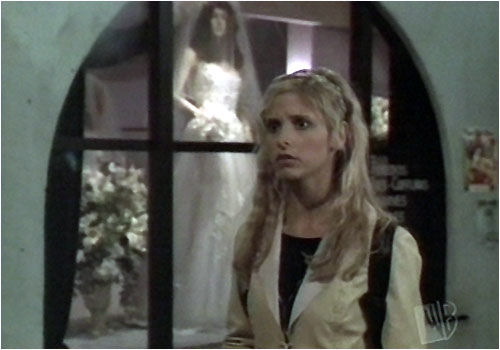 Buffy-Riley scene in front of the wedding dress store. A bit of a dud response from Fish boy, but Buffy was a cack! ;0>