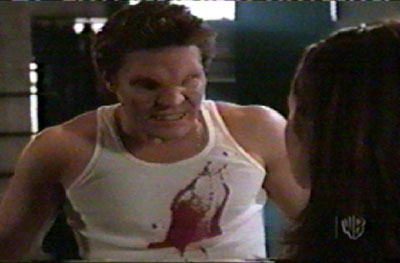 But man-o-man, that kiss! I wanna see him kiss Buffy with that much passion, violence, fire!! (Didn’t he look like he was enjoying it?) Relieved when he started whacking Faith around though, but I did like when she fought back to match him (still, Angelus-Buffy fight scenes win the rocking award). And didn’t Faith look damn good on top of him like that?! Woah, baby, watch where you stick that labido! And that "wriggle" line, (G)!