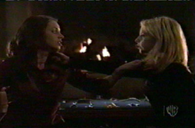 Faith-Buffy shippers would have loved the “Don’t worry, I”ll keep her warm” line – and notice how the Buffster wasn’t adverse to having Faith’s arm around her so cosily! Yeah, and I wanna know what Buffy was going to tell Faith about “when it comes to Angel, you should…” just before the demon guy appeared in the cemetary.