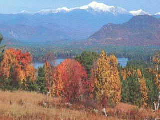 Snowcapped Mt Washington as seen from Conway Lake in the Fall.