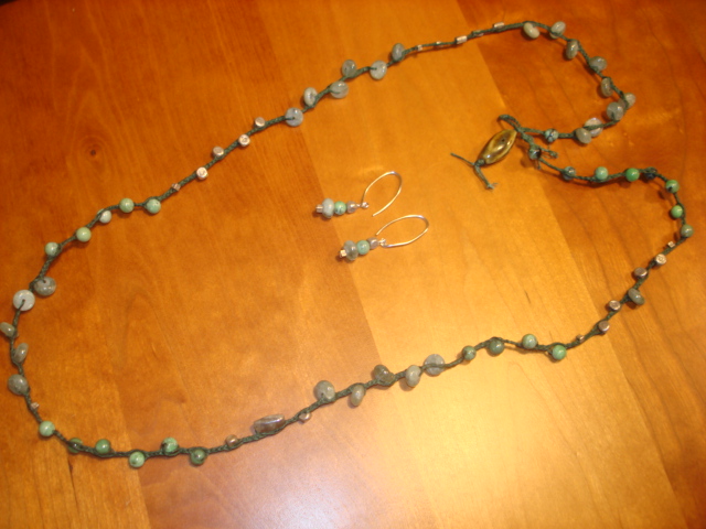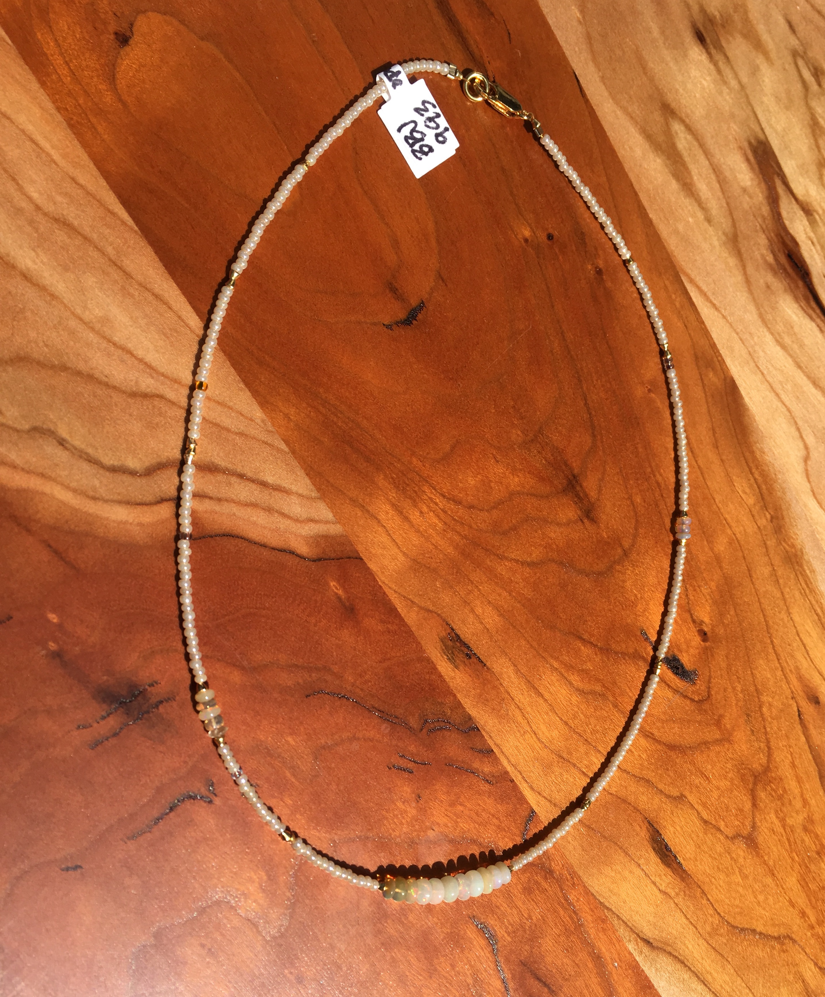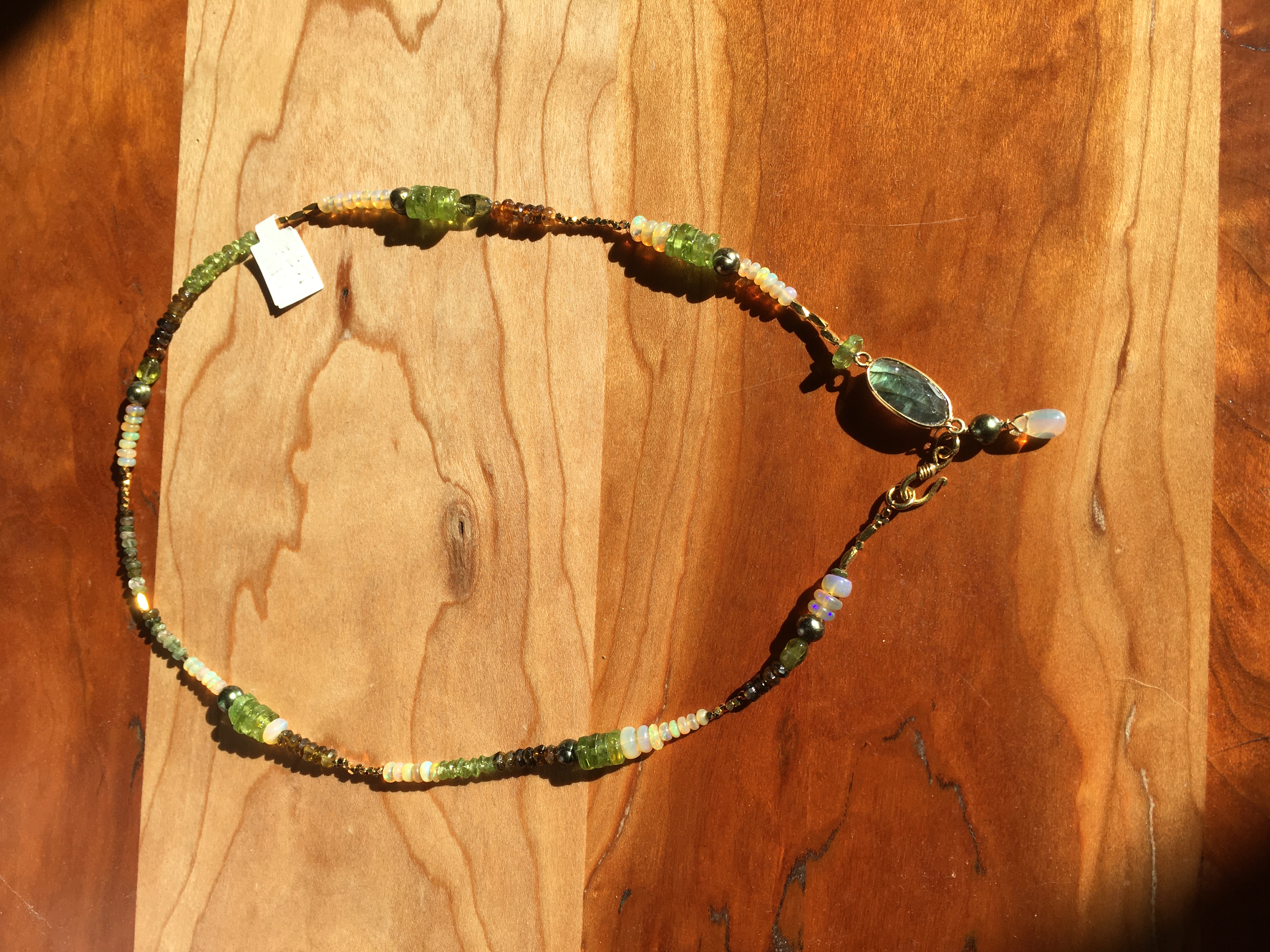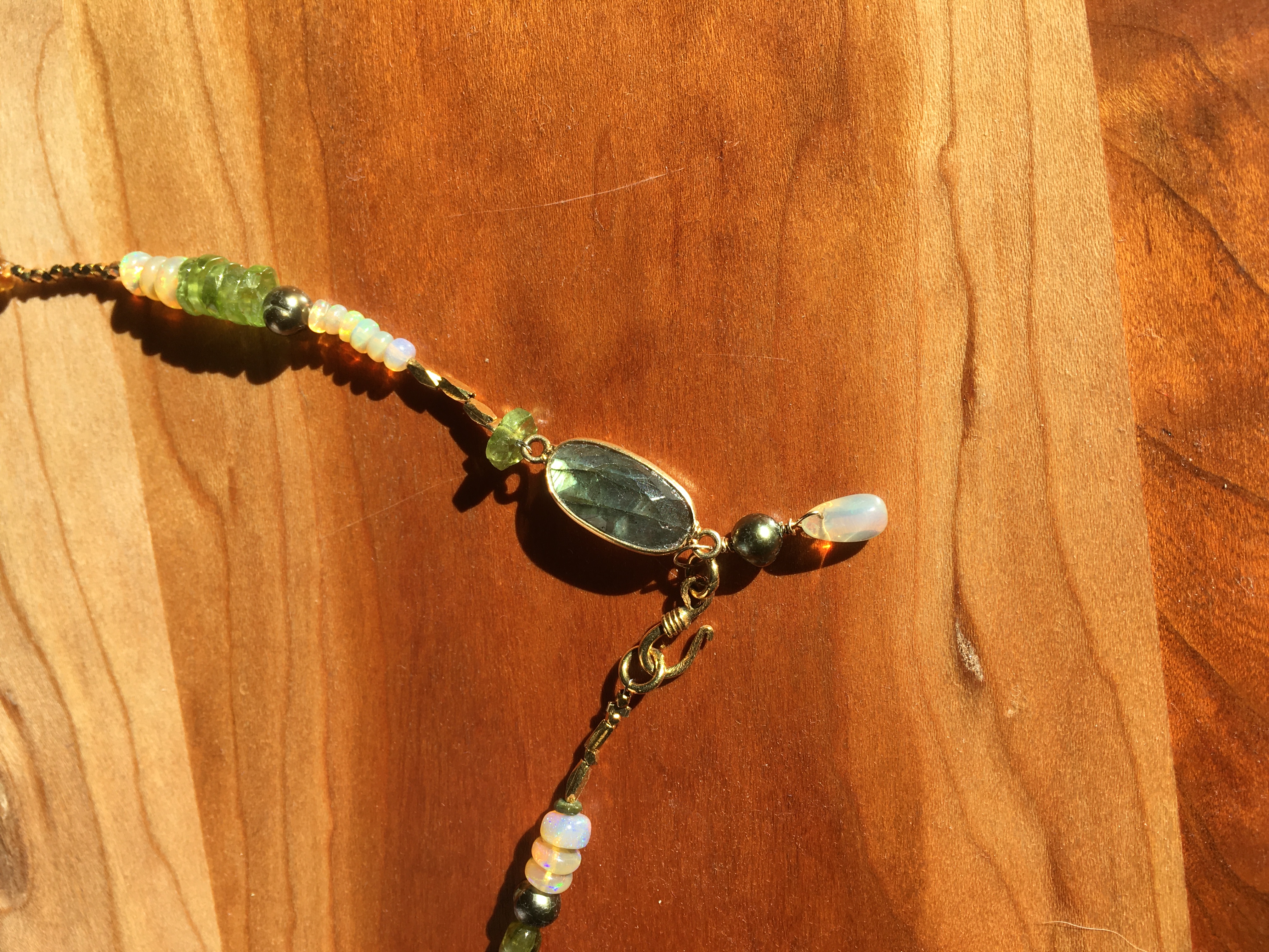 This necklace contains many rare and beautiful gems. Australian Opal, Peridot, Tourmaline, Pearl, Labradorite (the oval cabochon) and gold! 18 inches of shimmering shades of nature. | $70.00 | |