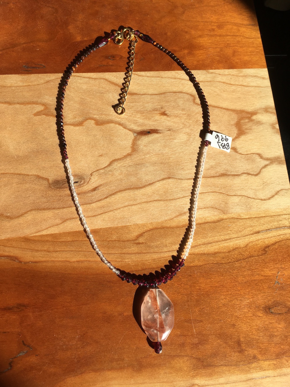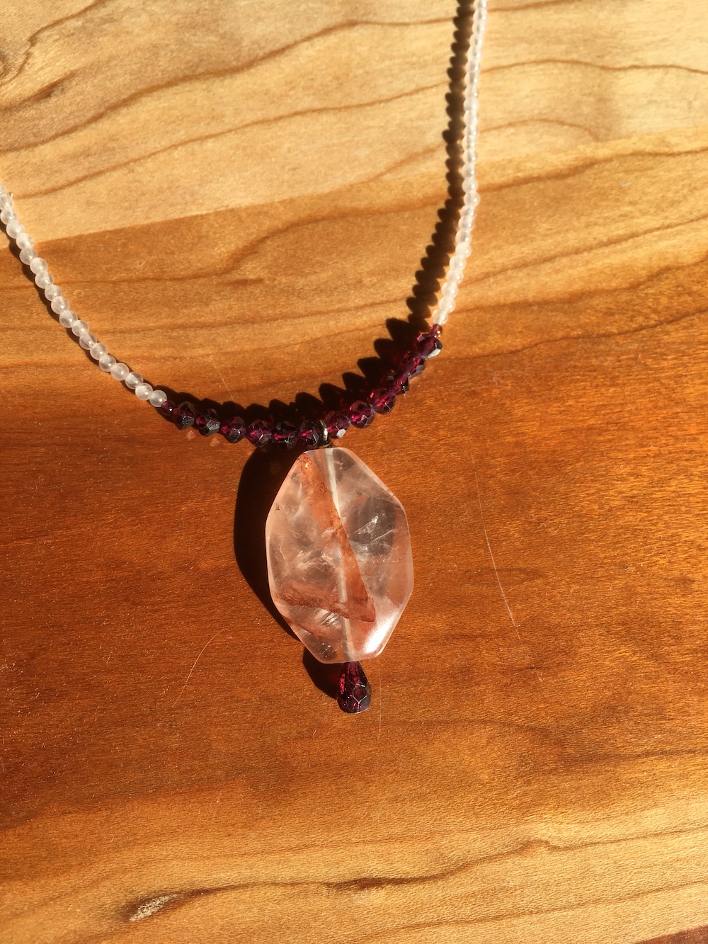 | Cherry Drop Necklace | Larger View | Large striated Cherry Quartz pendent in the highlight of this simple single strand of faceted garnet, rose quartz and red tiger eye. Hangs 16 to 18" inches in length. Cherry Quartz is great for concentration so is an excellent choice for anyone studying for exams. Healing properties for Cherry Quartz crystal can help with colds, flu and infections and can be of assistance with burns. |