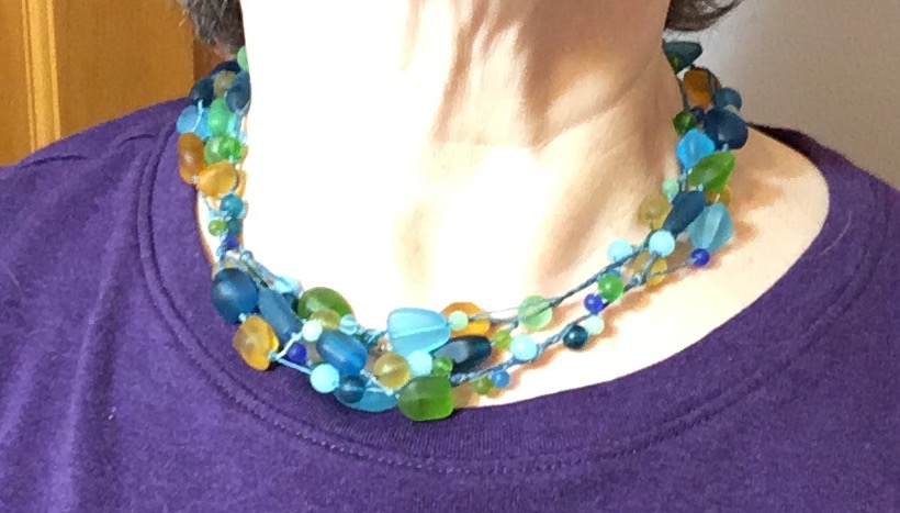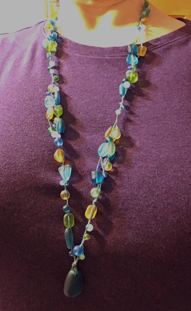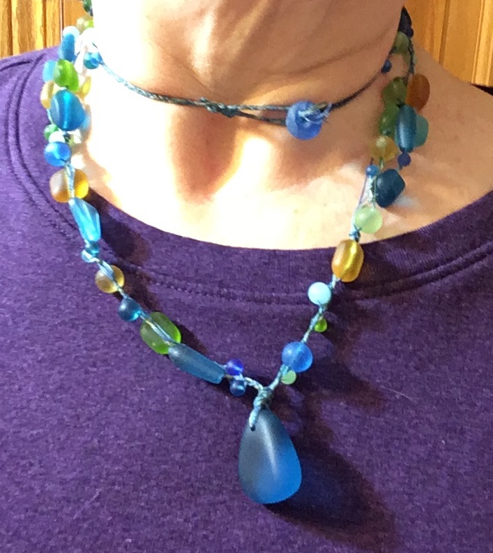 Cascading Sea glass-look Recycled glass beads braided and intertwined to add dimension and interest. Can be worn long or doubled with the pendnat in front or back. 37 inches total. Pendant hangs 1.5" down. Closes with a simple ball bead and loop. | $75.00 | |