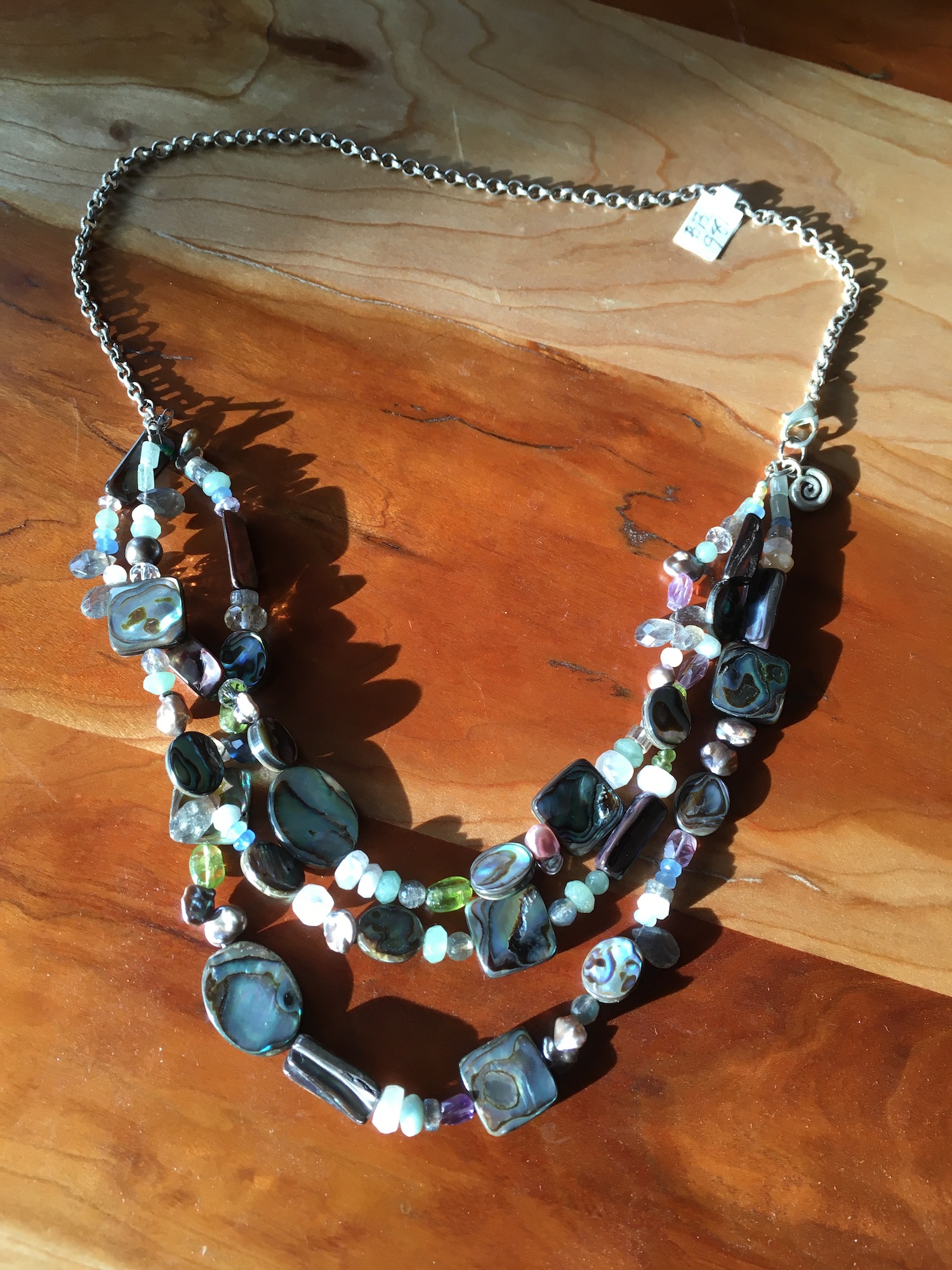 Mermaid Necklace![]() | Close up View | If mermaids wore necklaces they might look like this. Abalone is the star but there's also Labradorite, Peridot, Amethyst, Moonstone, Freshwater pearl, dyed shell, aventurine and crystal quartz. 22 inches long with sterling silver lobster clasp. | $65.00 |