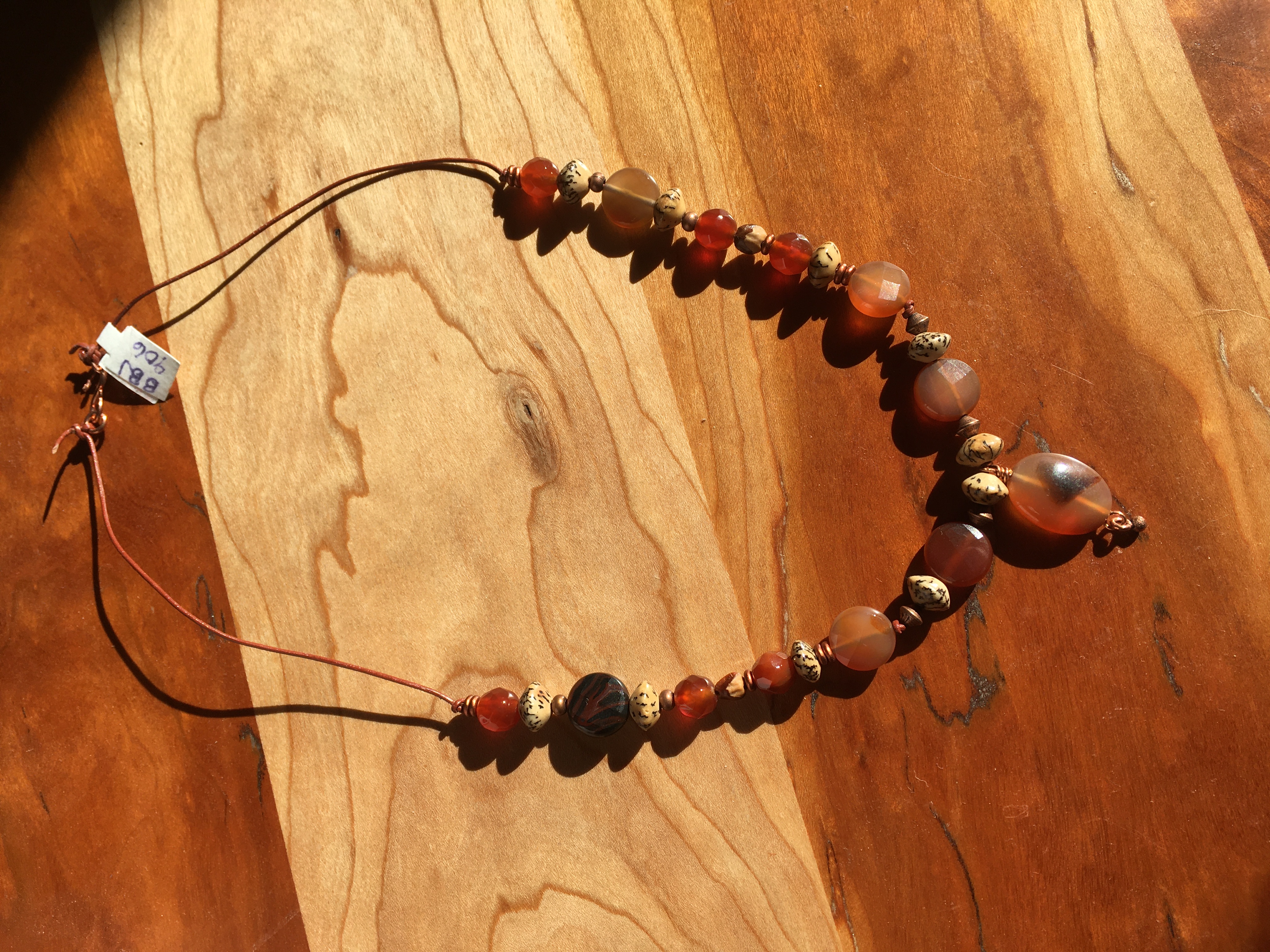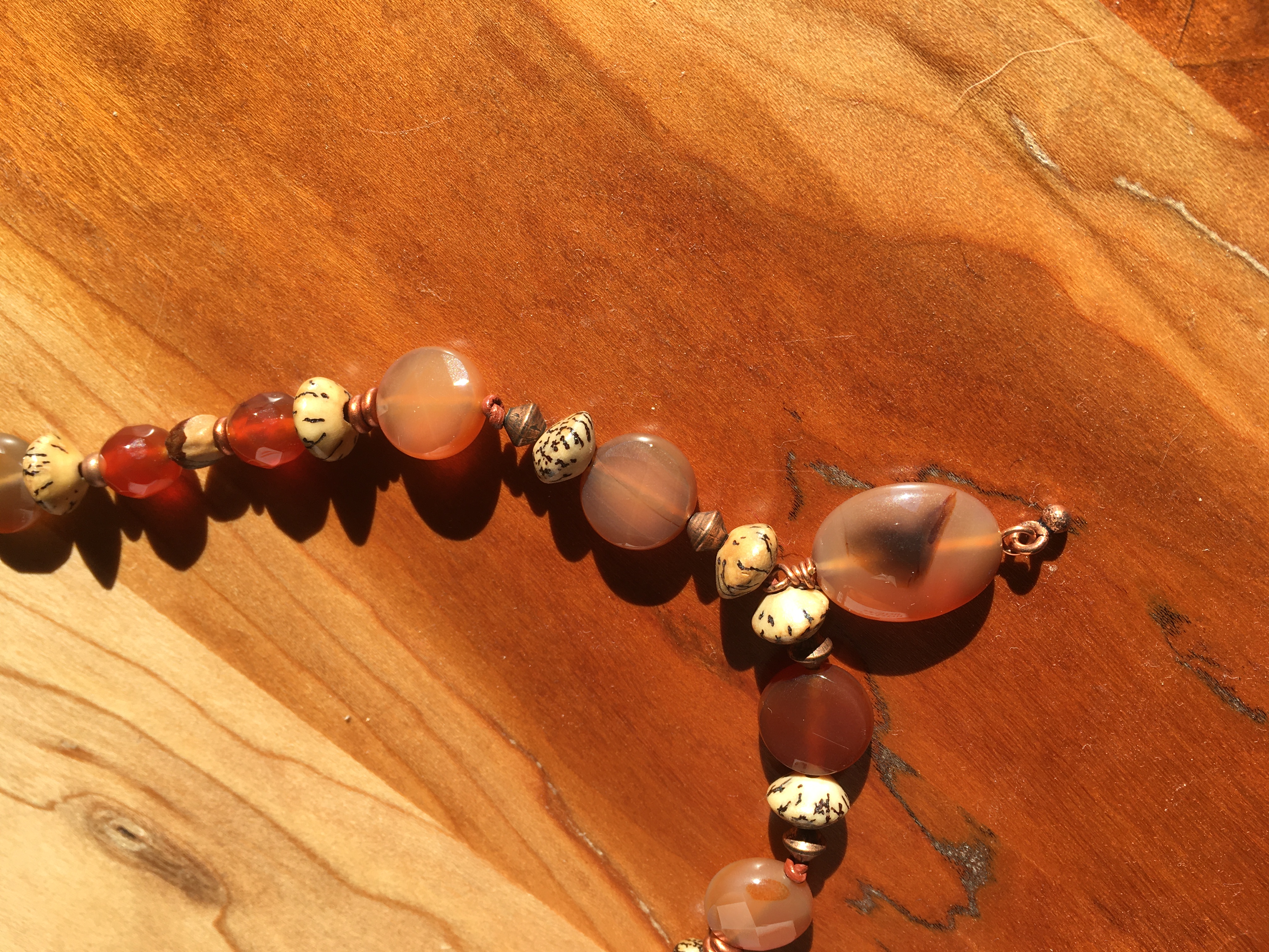 Large oval of Carnelian takes center stage united with Taugua Nut beads and copper. Hanging from a fine leather cord. 20" long. Carnelian - Strengthens voice, self-confidence, patience, counteracts doubt and negative thoughts. |