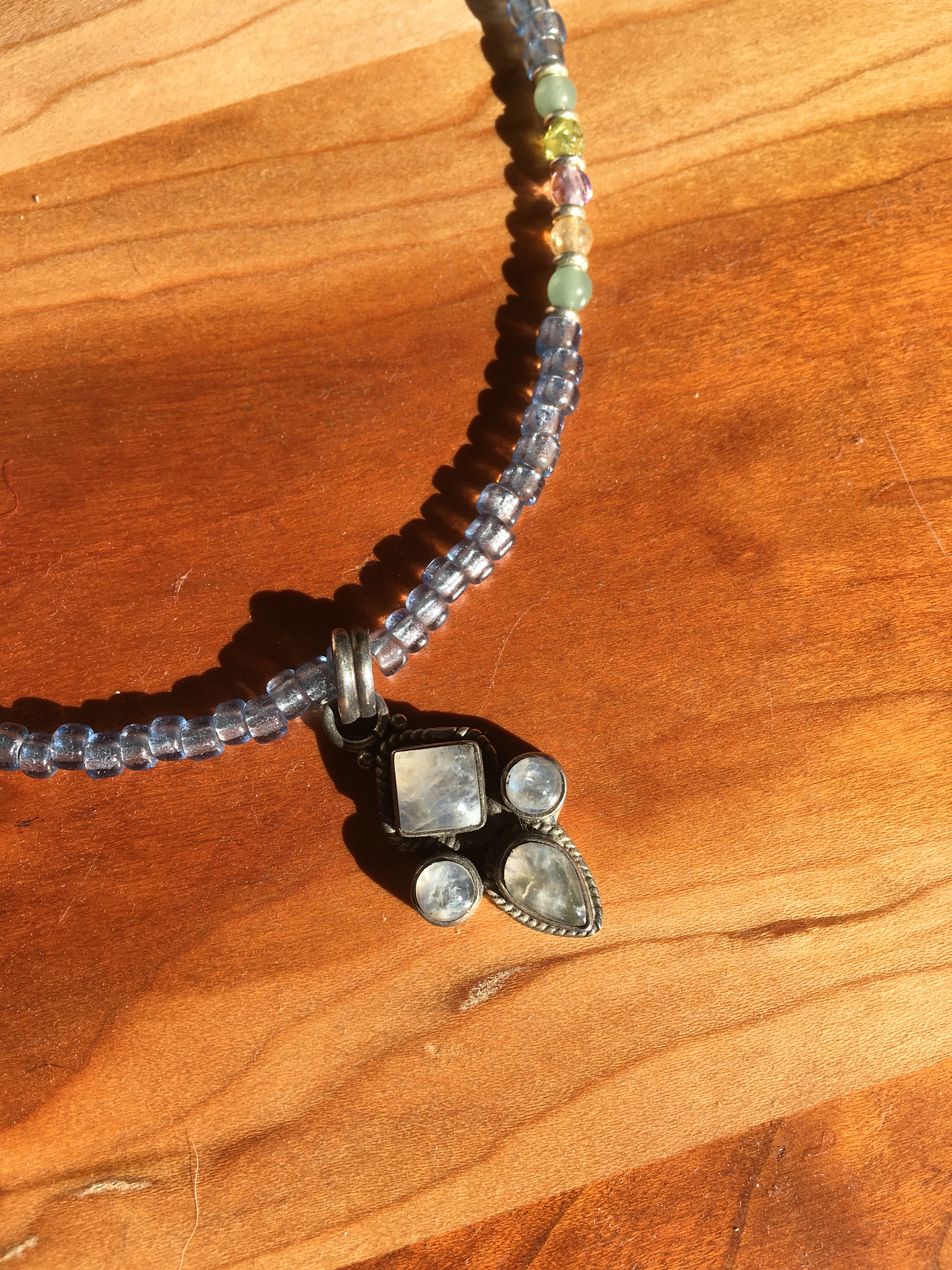 Vintage Venetian glass beads in iridescent pale blue. Touches of semi-precious rounds, Thai silver beads and a Bali Style Moonstone pendent complete this 20 inches long necklace. | $40.00 | |