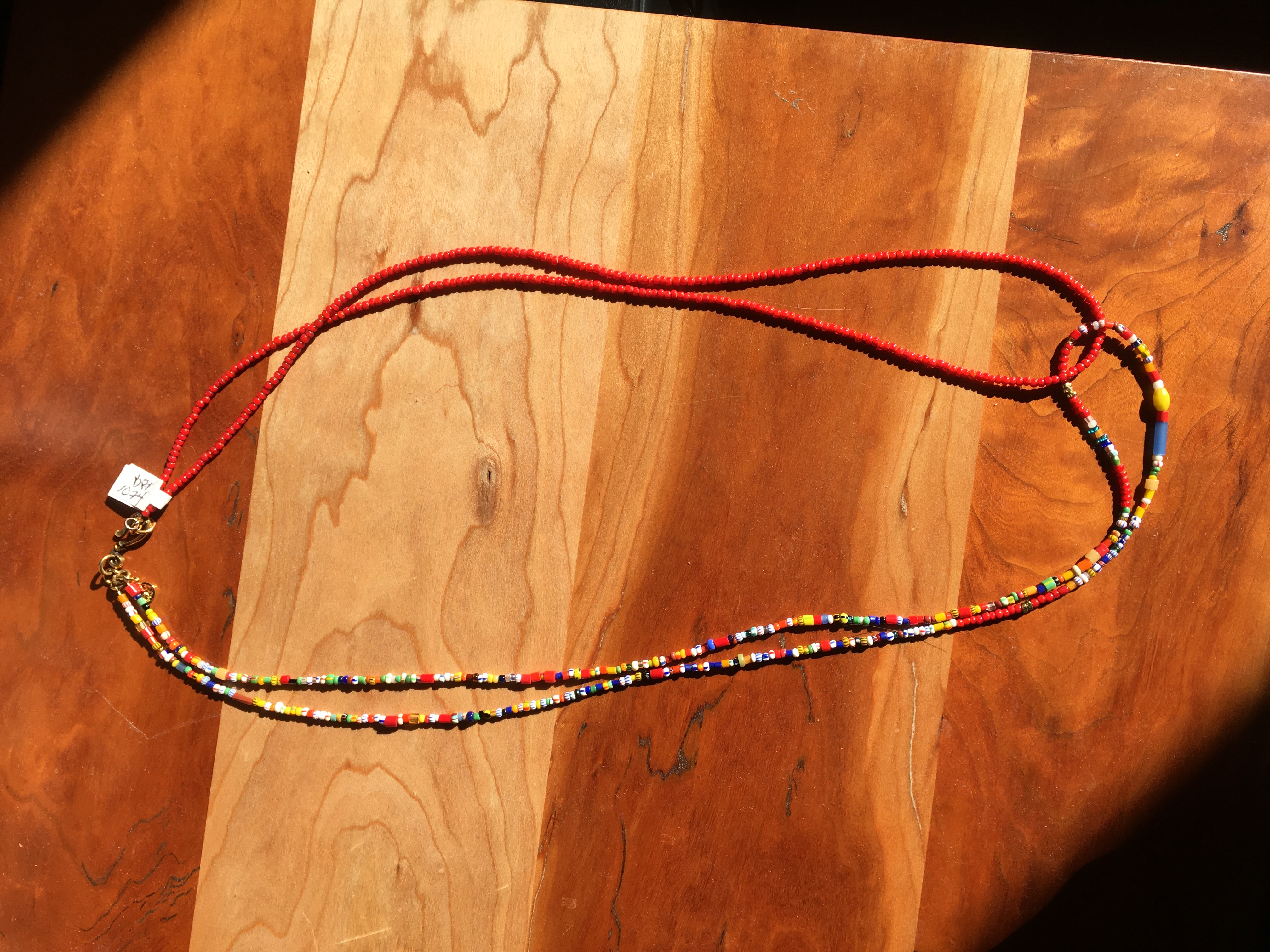 Interlocking strands of Antique Red White Heart beads and Christmas mix of trade beads. Please rest assured that these beads were traded for African spices and were made in Europe. 28 inches long. Gold Hook clasp finished with tiny Peace charm. | $40.00 | |