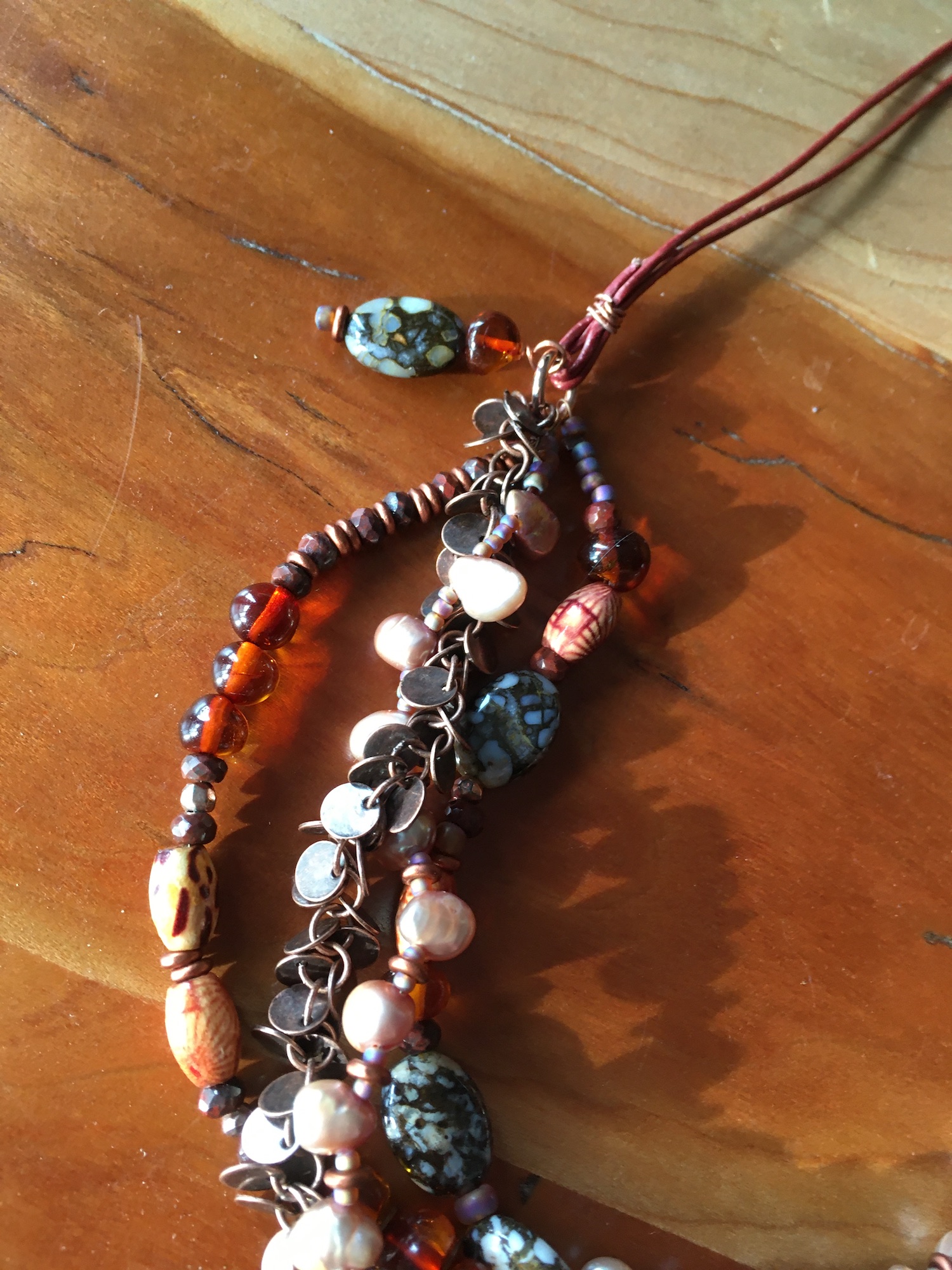 Warm Wood and Amber Necklace![]() | Larger View | Warm shades of copper and brown. This necklace has so much: Copper dangling chain, Freshwater Pearl, Wooden beads, Baltic Amber and Boulder Opal and more. 21 inches long with a copper S-hook clasp. | $65.00 | |