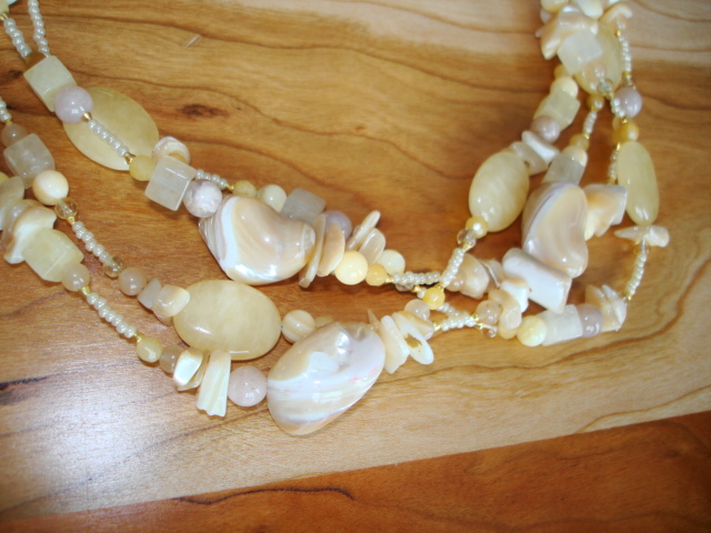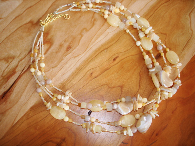 Rich, delicious creamy shades of golden honey, pale yellow and milky beiges. Closes with a gold vermeil hook clasp with an extra two inches of extender chain. 19 - 21 inches long. Honey jade, calcite, aventurine, creamy mother of pearl and more. Jade - Encourages practicality, wisdom, mental peace and tolerance of others. Calcite - Increases the power and effectiveness of a project about to be undertaken, increases psychic protection. |