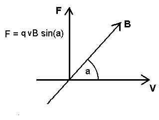 v x B is the 'cross product' of the two vectors, and if both vectors are in the horizontal plane as in the next example, with angle 'a' from v to B then the force q(v x B) is vertically upwards and has magnitude qvB sin(a).
