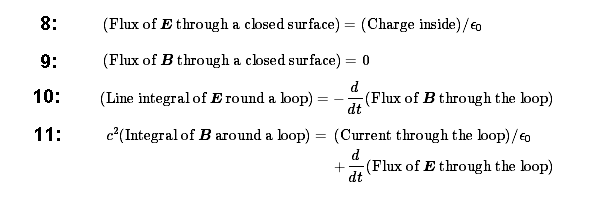Equations 1 to 4 are Maxwell's equations in what we could call 'differential form', on the grounds that they use the differential operator. They are however often easier to apply in 'integral form'. We then use 'flux', or 'surface integral', to specify the average field component perpendicular to a surface multiplied by the surface area, and 'circulation', or 'line integral', to specify the average field component along a loop multiplied by the distance round the loop. The 4 equations then become: