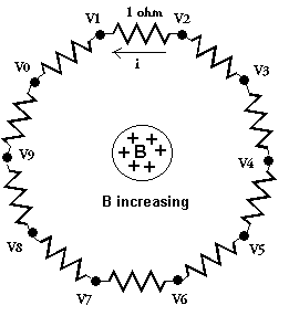 Again assume an increasing magnetic field confined to a central region, directed into the page. As previously there will be an electric field in an anti-clockwise direction round the loop, which will now cause a current to flow round the conductor. Suppose the current is 1 amp, then applying Ohm's Law we would expect a voltage of 1V across each resistor, and for these to add as we progress round the loop. Define the starting point as zero volts, then when we get back to the starting point we expect an extra 10V, but we are back to the starting point and the voltage there is still zero, so we are forced to conclude that there must be zero voltage across each 1 ohm resistor carrying current 1 amp. So we find just applying Ohm's Law gives us the wrong answer. What we need is to go back to equation 7 which tells us that the field E = -dV/dx -dA/dt. The scalar potential is zero everywhere round the loop, but there is still an electric field causing a current to flow because of the varying vector potential.