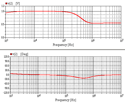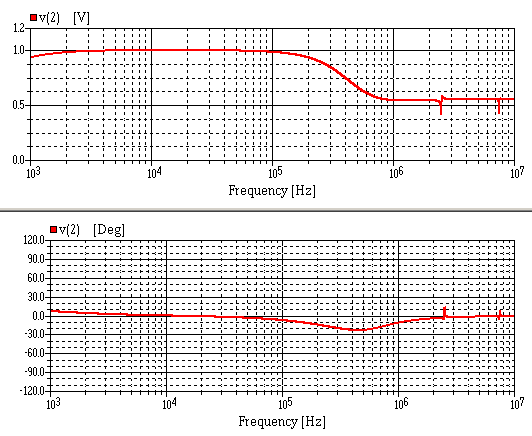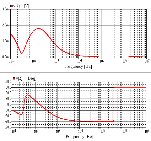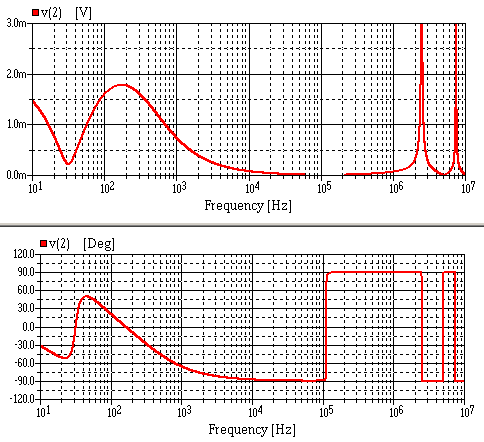 What we find is that up to about 300kHz the line has little effect, the plots look about the same with the line reduced to just 1cm in length. At 350kHz however something dramatic appears to happen, the admittance remains very low (i.e. high impedance) but the phase angle jumps from +90 to -90 (remember the plot reverses the sign). Up to that point the 2mH inductance of the speaker is dominant, but the line has an equivalent capacitance about 100pF and this causes a parallel resonance at 350kHz and the impedance is then capacitive at higher frequency. As stated earlier the phase angle never goes beyond 90deg in either direction.