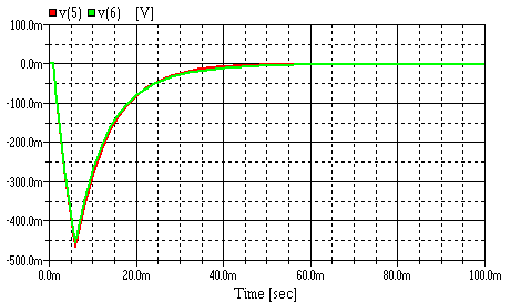 It can be seen that the two results are very similar, both have significant negative output voltage for some time after the input pulse has ended at 6msec. The capacitor plus DA has slightly less of this continuing output and so if we wanted to minimise this 'error' we again find that DA could actually be a benefit. Again however a far greater improvement can be achieved just by increasing the capacitor value.