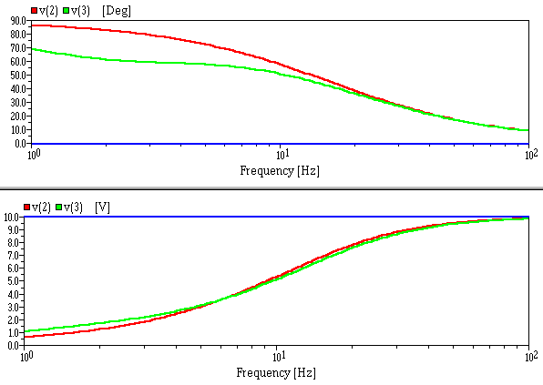 Keeping the capacitor fixed at 1uF and adding another 1uF in series with 100k to simulate a rather extreme example of the DA effect we actually find that the amplitude errors are little different, but there is a clear reduction in phase error at low frequencies when the DA is added (shown below in green). It would be misleading to suggest that DA is therefore a good thing. Increasing the coupling capacitor to 10uF will give a far greater reduction of amplitude and phase errors. (Actually, it is debatable whether the 1uF with added DA described here should be regarded as a 1uF or a 2uF capacitor, it depends on how we choose to define or measure capacitance.) Just comparing the two phase graphs the DA effect reduces the phase advance, easily interpreted as a relative phase delay if we mistakenly take the ideal capacitor to be our reference standard, which could lead to the conclusion that DA adds time delay when in this application it actually adds less phase advance.
