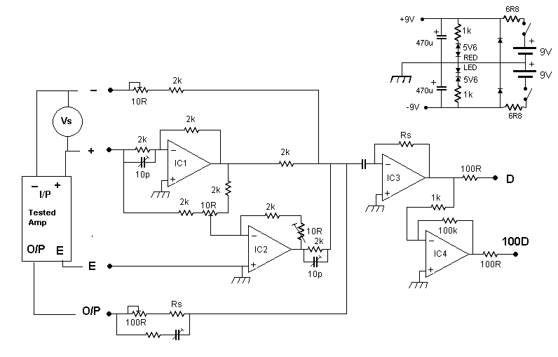 The output earth of the amplifier being tested is used as the earth reference for the measurements, and the input earth goes to either the + or - input of the test circuit for inverting or non-inverting amplifiers respectively. This ensures any voltage difference between the input and output earths is detected. The connection to the amplifier output is marked O/P and connects via resistance Rs, the value of which depends on the amplifier gain. For testing an amplifier with gain A the value of Rs needs to be Ax2k, or slightly less, with fine adjustment needed for accurate signal nulling. A parallel trimmer capacitor can improve nulling at higher frequencies. This is not ideal, but may be good enough provided the tested amplifier has a simple first-order low-pass response. Another resistor with the value Rs is included in the test circuit, this is to give unity gain for the distortion component at the output marked D. A further x100 stage gives a more easily observed 100D output suitable for detecting via a sound card or oscilloscope.