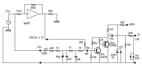 The test circuit feedback amplifier has two inputs, one is the original test signal Vin, taken via a gain and phase adjustment network, the other is the MJR7 output, which is taken via 56k so that the test amplifier with its 56k feedback resistor gives gain -1. With careful adjustment of the variable resistor and capacitor the Vin and -18Vin can be made to cancel, leaving just the distortion D. In practice accurate nulling of Vin is difficult, but reduction by 40dB is enough to make accurate measurement possible.