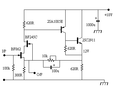 Here is an example of a unity gain buffer. There are many possible circuits, and some available as integrated circuits, but most have the disadvantage of needing two supply rails if a direct-coupled input is to be used. The circuit shown next has a jfet input and a single supply rail. At first sight it may seem that the output is taken from the wrong point, but with this arrangement the electrolytic and preset are kept inside the feedback loop to reduce any distortion they may add. Although the input is direct-coupled any dc input should be kept low.