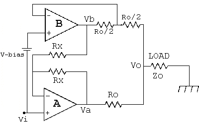 Whatever voltage, Vb, appears at the output of B, it is inverted by amplifier A so that Va = -Vb, and added to the original via resistors Ro. The result of this is that Vb is cancelled, and the output Vo across the load is completely independant of amplifier B. It has been assumed that amplifier A has infinite open-loop gain to make Va = -Vb, but a finite gain can be compensated for by adjusting resistor values, adding trimmer capacitors etc., and in principle exact cancellation is possible.