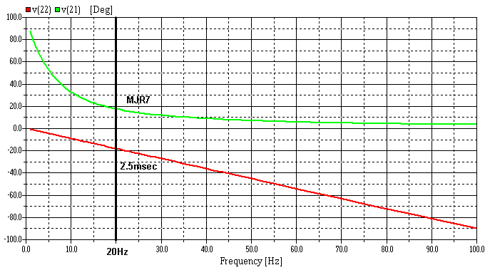A Wireless World article from May 1995 claimed that almost any amplifier low frequency cut-off was a bad idea, resulting in a low frequency time delay, with the resulting bass being out of time with the rest of the music. A calculation shows my MJR7 amplifier phase advance at 40Hz to be the same effect produced by a time shift of 694 usec, but there are no real time delay elements involved, apart from maybe a nanosec for the signal to travel the length of the circuit board. Also a phase advance looks more like a time advance than a delay. So where did this 'time delay' idea come from. What we find in the article are plots of 'group delay', showing a positive group delay at low frequencies. That is correct, but there is then an assumption that a positive group delay is also a time delay. I covered this in a limited way in my Group Delay, Time Delay, and Phase Shift page, where I demonstrated that a real time delay is not the same thing as a group delay, but they can have an almost identical effect over a limited frequency range. So ok, let's just look at the range from 0 to 100Hz. There the MJR7 amplifier phase starts at over 90 deg and falls in a negative direction as frequency increases. We can compare this to a real time delay with similar group delay, in the next plot green is the MJR7 phase, and red is a 2.5msec time delay. I used a linear scale for frequency, so the constant time delay is a straight line: