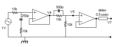 This looks surprising if we imagine our signal starts at a precise point in time, t0, then there will be no signal after the delay line until t0 + 2usec, so how can a simple RC network cancel that delay and produce an output at t0? The simple answer is that band limited signals don't have a precise starting point, or to put it another way, a signal with a precise starting point is not band limited. I covered that in my Feedback Effects page in the section about time delays.Now consider an example of group delay in an audio amplifier, if we thought the group delay from input to output was a real time delay we could imagine that the feedback would arrive back at the input too late to counteract high frequency or crossover switching distortion.