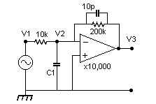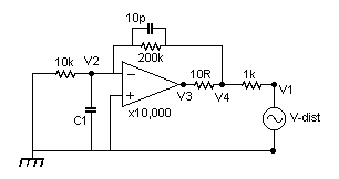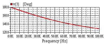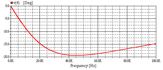 Here is a basic inverting amplifier with gain 20 and a 10p capacitor in parallel with the 200k feedback resistor, giving closed loop -3dB at 80kHz, and the following phase plot shows 15deg phase lag at 20kHz, and therefore group delay from 0 to 20kHz about 2usec. The capacitor C1 makes very little difference to the phase for values tried from 0 to 470pF. The reason for its inclusion may become clear later.So how well does the feedback reduce distortion at different frequencies? To find out a 1V distortion signal is injected into the output via 1k, and with no feedback and the 10R open-loop output impedance shown there would be about 10mV at the output, V4.