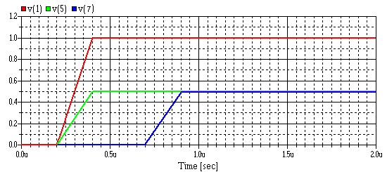 To confirm that no real time delay is involved with this group delay, add a real delay of 0.5 usec to the output and apply a fast voltage step (V1, red) to the input. After the 'group delay' and compensating phase advance filter we get an attenuated but not delayed step (V5 green). Then after this is passed through the 0.5usec delay line, we find a real time delay (V7 blue). The larger 2usec 'group delay' has been cancelled by a simple RC filter, but there is no way to cancel the real 0.5usec time delay, until someone invents time travel. To put it another way, a positive group delay can be cancelled by a negative group delay (see references 1,2,3), but there is, as far as I know, no such thing as a negative time delay. However....