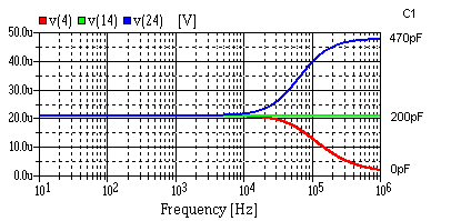 At higher frequencies C1 has a significant effect, though up to 20kHz the effect is still small. With C1 = 0pF the increased feedback via the 10pF reduces high frequency distortion (even though its inclusion adds 'group delay' at the output). With C1 = 200pF the ratio of the 200p and 10p capacitors is the same as the ratio of the 200k and 10k, and the feedback loop gain is constant, and gives a constant distortion level. Increasing C1 to 470pF the loop gain now falls at high frequencies and so distortion rises. I included this because I used a 470p capacitor here in my MJR7 mosfet amplifier. The effect on potentially audible distortion up to 20kHz is very small, but what I have left out so far is the question of feedback loop stability. We need to get the loop gain down to unity before enough phase lags accumulate to make the excess loop phase shift reach 180deg, and including that 470p plays a central role in achieving stability while maintaining a high loop gain to minimise distortion.