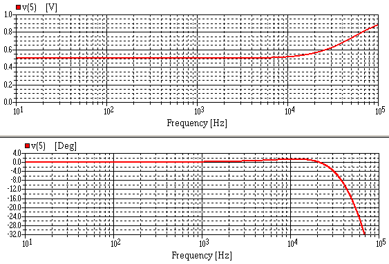To illustrate the differences between group delay, time delay, and phase shift, the next circuit was simulated. The input filter reduces the gain at high frequencies by 6dB and adds phase lag, the phase shift being as shown in the first plot below for V4.